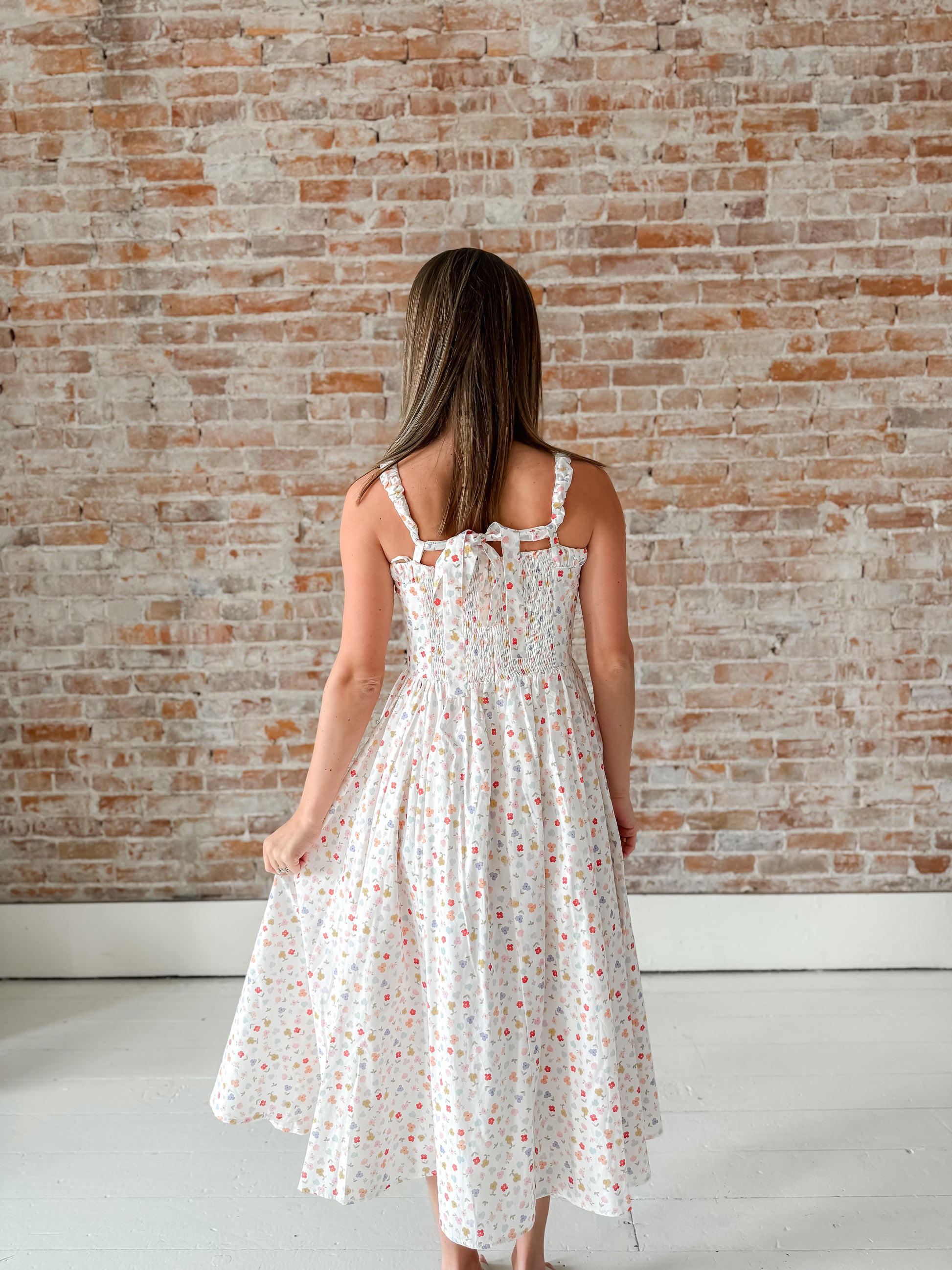 The Agnes Petal Dress combines effortless elegance with thoughtful construction. Crafted from a lightweight cotton blend, this piece features a structured bodice with a smocked back panel that moves with you, paired with a gracefully flared mid-length skirt adorned with a delicate multi-color floral print. The square neckline and wide straps provide flattering support, while hidden side pockets add practical charm. A self-tie back detail and airy drape make this dress perfect for warm days and versatile styling—from casual outings to garden gatherings.