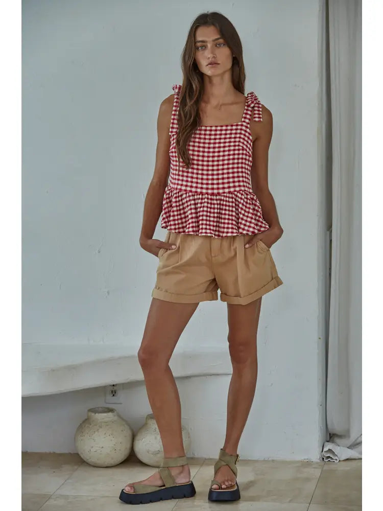 Woven Polyester Gingham Print Sleeveless Tie Shoulder Straps Square Neck Peplum Top with Rayon Lining