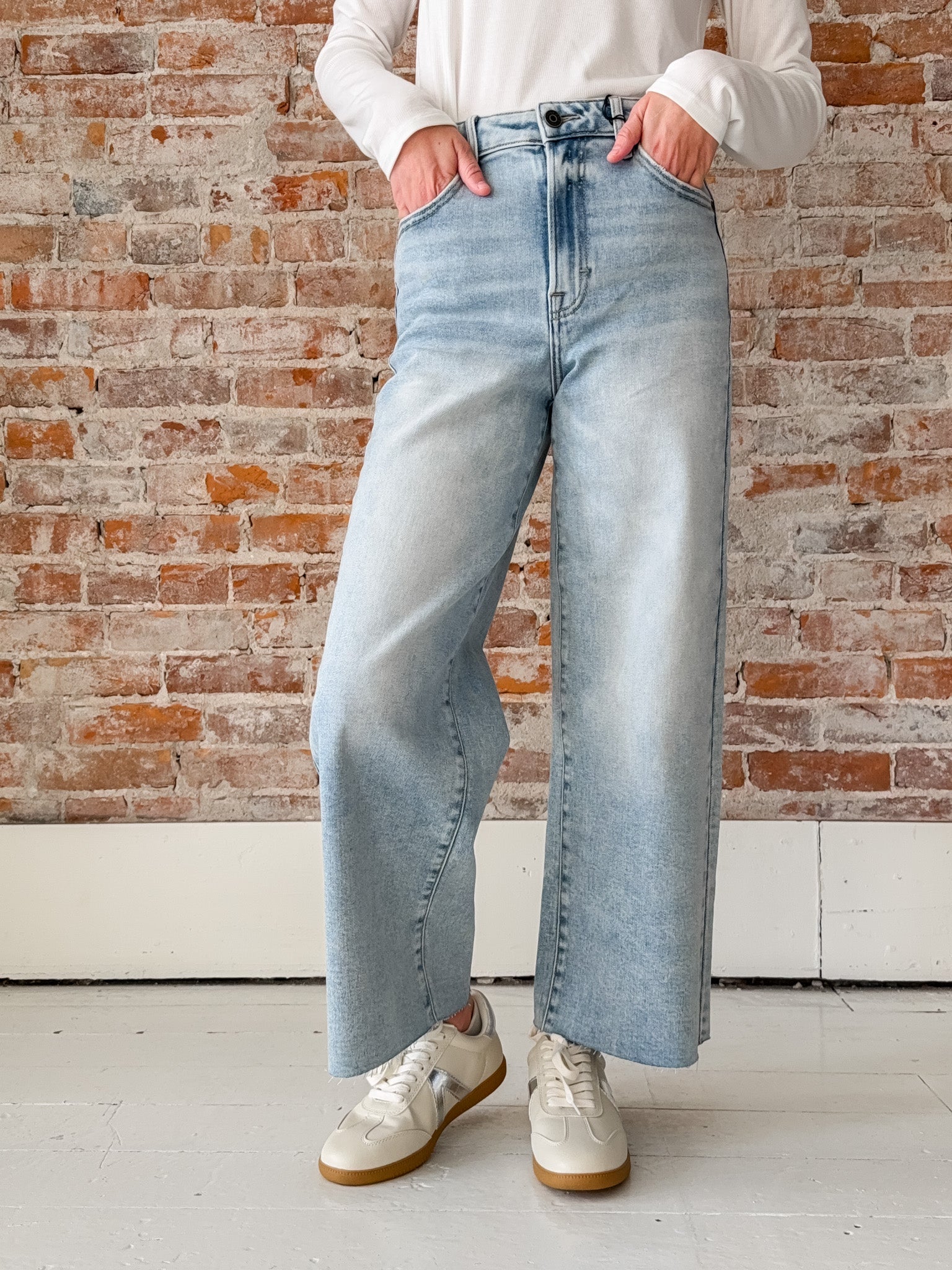 The Nori Jean brings together classic denim appeal with contemporary styling. Cut with a high-rise waist for a flattering, secure fit, the wide-leg design creates an elegant drape that feels both relaxed and refined. A raw hem crop keeps the look fresh and on-trend, while the light wash brightens your everyday rotation. Engineered with stretch denim, these jeans move with you and maintain their shape through countless wears.