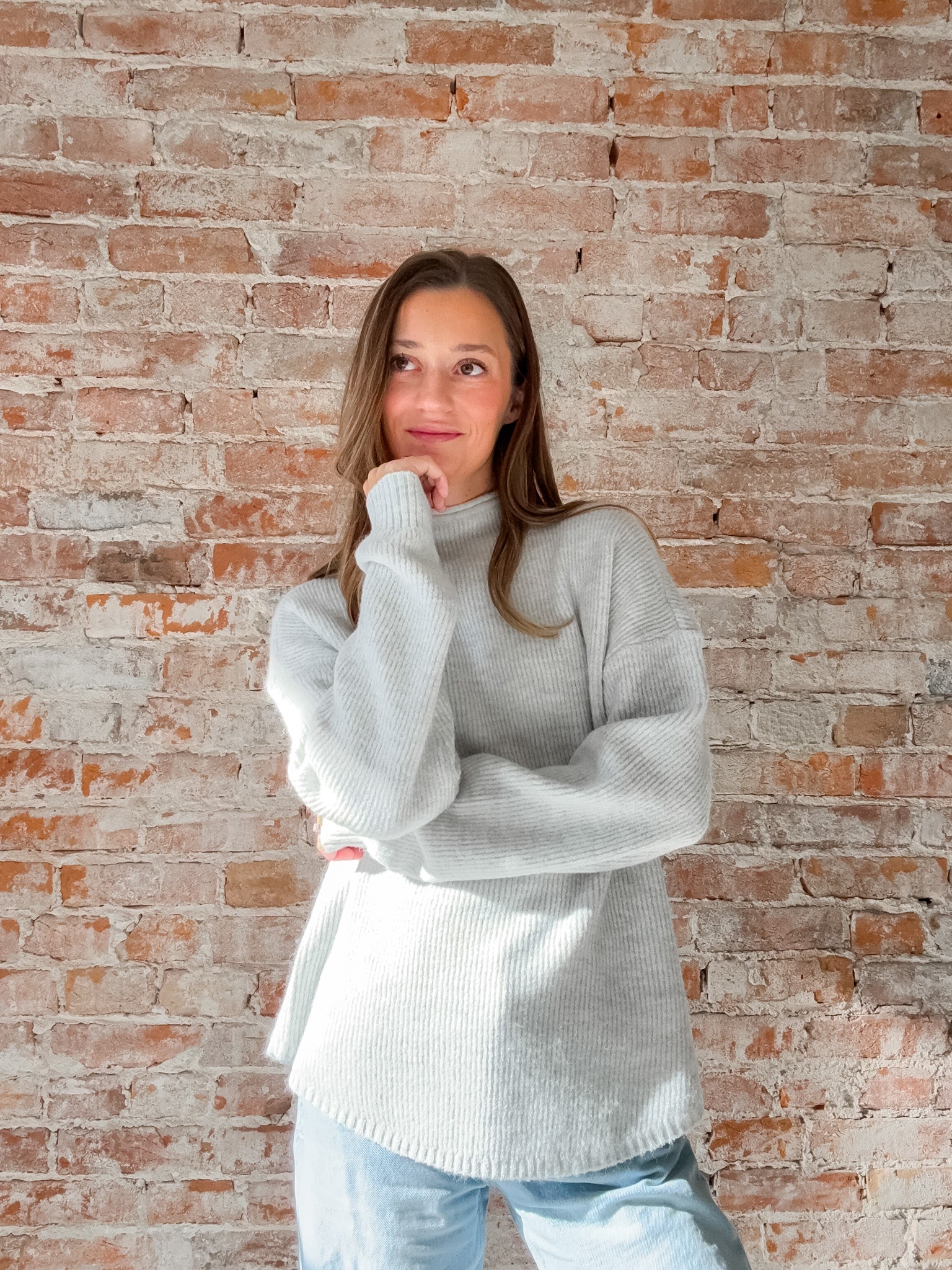 Introducing the Nannie Sweater! This cozy mock neck sweater in sophisticated silver grey is perfect for those days when you want to look put-together without trying too hard. The timeless color pairs effortlessly with everything in your closet, while the mock neck adds just the right amount of polish. Whether you're heading to the office, grabbing coffee with friends, or settling in for a relaxed weekend, this versatile sweater has got your back. Soft, stylish, and endlessly wearable—what's not to love?